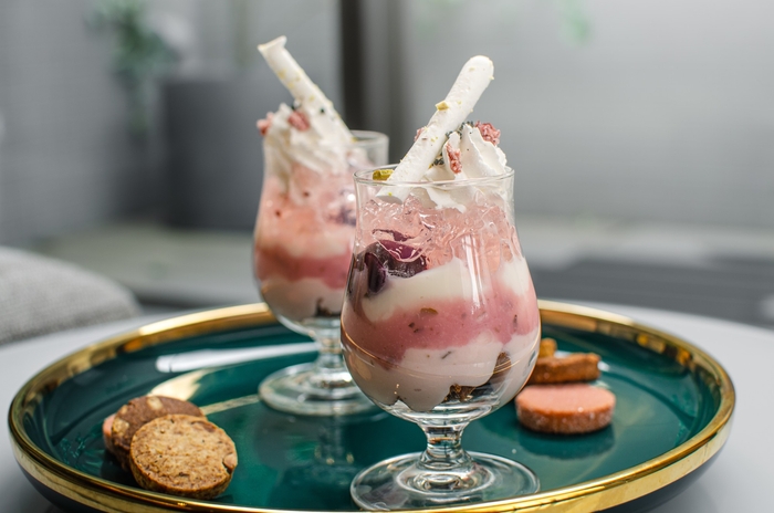 上段を飾るのは、桜と苺とクランベリーのパフェ。オパリーヌ、デギゼ、シュトロイゼルなど、様々な食感と味わいが重なり合う、贅沢な一品です。