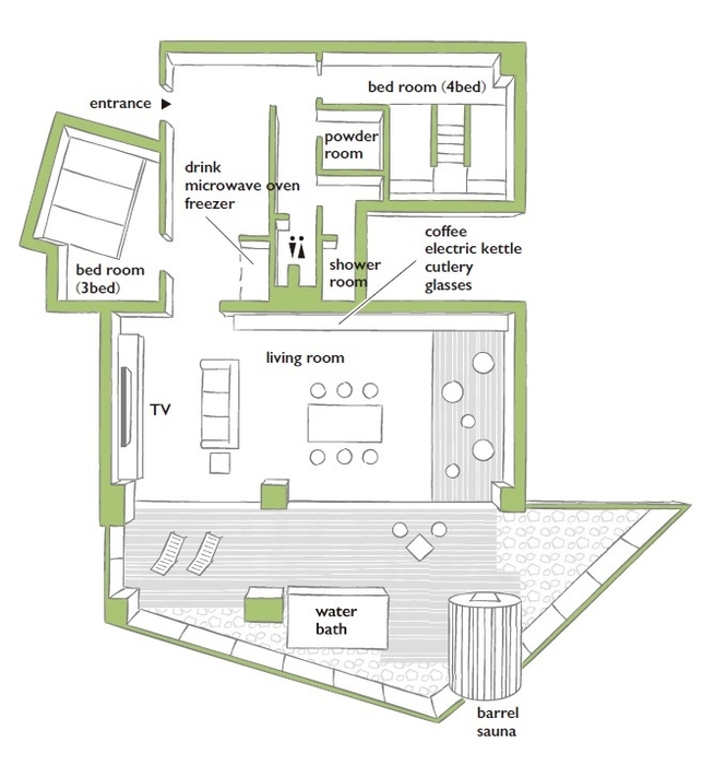 ・プライベートサウナがあり、2ベッドルーム最大7名が過ごせるルーム