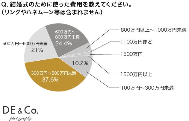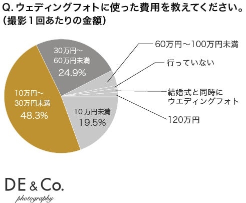 ウェディングフォトの費用は、結婚式の10分の1以下。 結婚式にかける費用については、「300万円〜500万円未満」(37.6%)が最も多い結果となりました。その次に「600万円〜800万円未満」(24.4%)が続くなど、高い予算を設定する方もいらっしゃいます。一方でウェディングフォトは「10万円から30万円未満」(48.3%)が一番多い結果となり、「30万円〜60万円未満」(24.9%)が続いたことから、ウェディングフォトにかける費用は結婚式よりも格段に低いことがわかります。