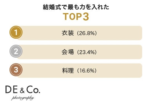 結婚式とウェディングフォトともに、「衣装と場所」に力を入れる傾向が明らかに。 結婚式で最も力を入れたポイントについては「衣装」(26.8%)が最も多い結果となり、次いで「会場」(23.4%)が多い結果となりました。ウェディングフォトにおいては、「撮影ロケーション」(58%)が最も多い結果となり、次いで「衣装」(18%)が多い結果となりました。