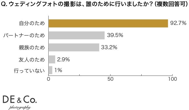 「結婚式やウェディングフォトを誰のために行ったか?」については、結婚式は「親族のため」と回答した方が92.2%で一番多い結果となりました。一方、ウェディングフォトは「自分のため」と回答した方が92.7%で一番多い結果となったことから、結婚式が感謝や喜びを家族や友人と共有するために実施される傾向にある中、ウェディングフォトはおふたりで楽しむために行われる傾向が明らかとなりました。