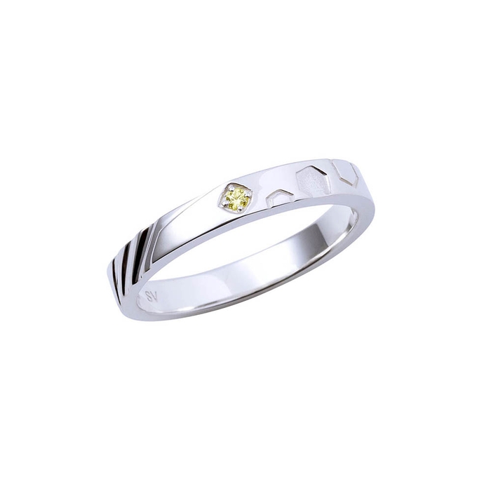 表面には六角形やラインをデザイン、中央にはユニットカラーストーンをセットし内側にはユニット名を刻印しました。Wの世界観を取り込んだ平打ちフォルムのデザインです。