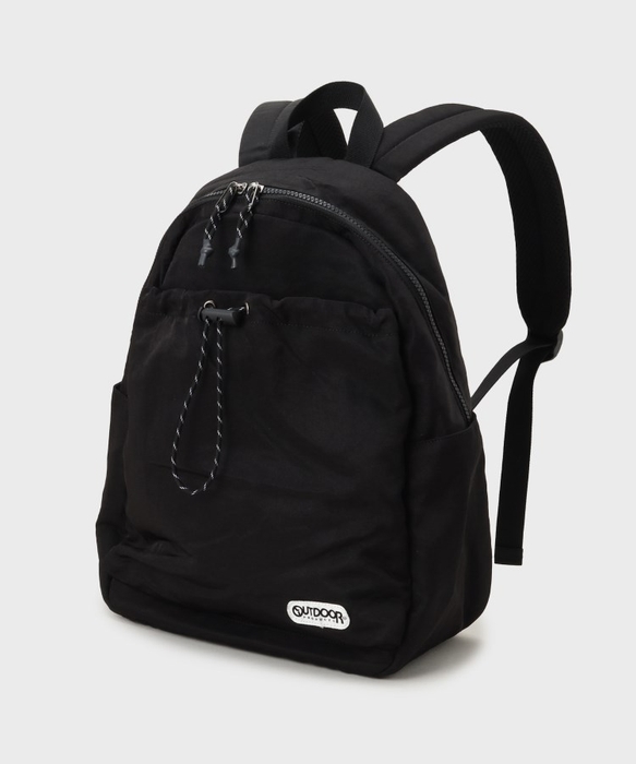 OUTDOOR PRODUCTS別注ドロストバックパックは、大きなドロストポケットをアクセントに、表情のある微光沢のナイロン素材で大人の女性が持ちやすいデザイン。