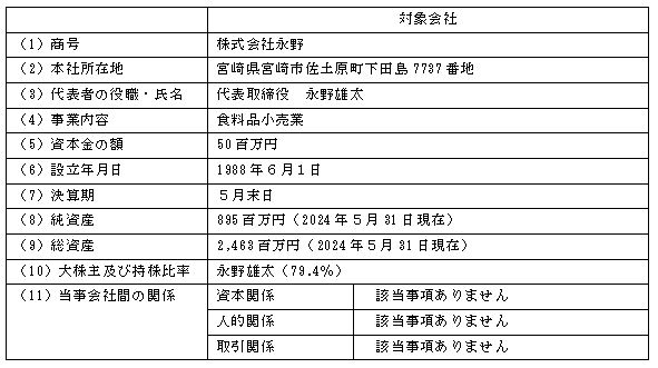 当社は本日開催の取締役会において、当社の連結子会社である株式会社丸久(以下「丸久」という。)が、永野雄太氏他3名の売主(以下「売主ら」という。)と株式譲渡契約(以下「本契約」という。)を締結し、売主らが保有する株式会社永野(本社所在地:宮崎県宮崎市佐土原町下田島7737番地、以下「永野」という。)の発行済株式を取得することを決議いたしましたので、下記の通りお知らせいたします。