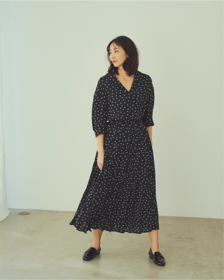 デコルテを切り取るVのライン、襟の大きさ、タックを入れて膨らみをもたせた袖のシルエット。随所にこだわりを詰め込んだ、レディライクな一着。ポリエステル100%で、シワになりにくく、洗濯機で洗えるのも高ポイント。
