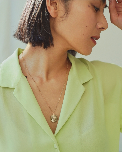 コイン部分にアンティーク風の加工を施したネックレス。素肌だけでなく、ニットやレザーなど、厚みのある服の上にのせても、埋もれない存在感があります。チェーンの長さは2パターンのアレンジが可能。