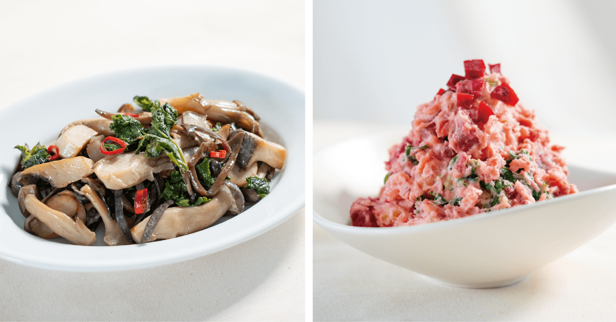 (左)ケールと味わう4種のきのこのアンチョビマリネ
