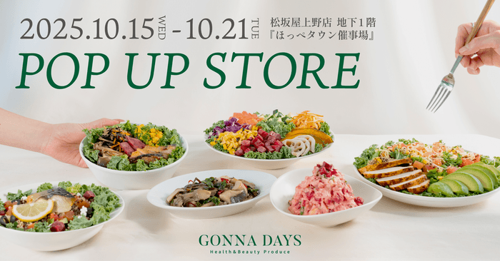 この度、GONNA DAYSが2025年10月15日(水)〜10月21日(火)までの7日間、松坂屋上野店 地下一階 ほっぺタウン催事場にPOP UP STOREとして再登場いたします。前回の出店では連日完売となるほどの盛況を博し、サラダや新商品のデリカテッセンは「どれも試したい!」と大変ご好評をいただきました。