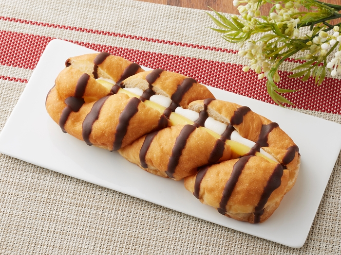 ★ツイストドーナツに、カスタードクリームとホイップクリームをダブルで並べて絞り、チョコを線掛けしました。ふんわりとしたドーナツに2種類のクリームをサンドしました。