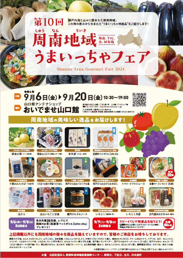 日本橋にある、山口県アンテナショップ「おいでませ山口館」にて、「第10回周南地域うまいっちゃフェア」を開催。瀬戸内海と山々に囲まれた、周南地域ならではの「うまい!」を販売します。