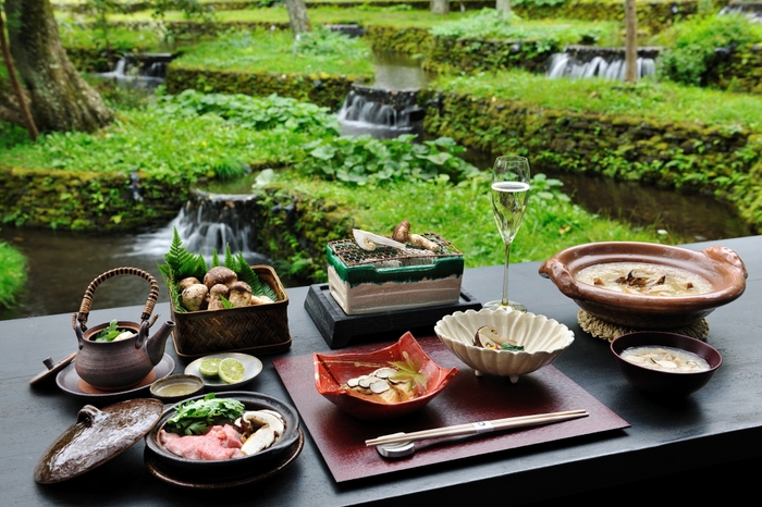 メインダイニング「日本料理嘉助」のテラス席にて提供する、松茸とシャンパーニュの朝食プランです。朝から松茸尽くしの献立をシャンパーニュと共に提供します。