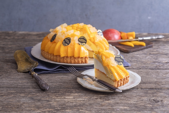ケークタルトにマンゴークリームと金柑のコンポートを重ねました。濃厚な甘みと果汁たっぷりの宮崎県産「完熟マンゴー」と爽やかな日向夏のジュレを飾った季節のタルト。