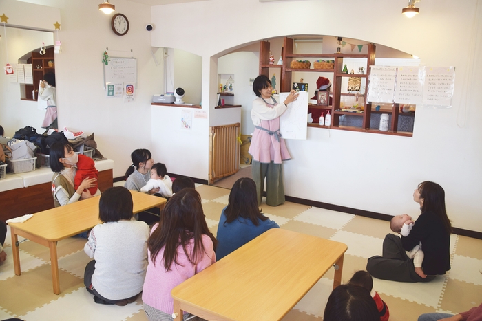 0歳の赤ちゃんとママ13組に集まっていただき、看護師さんから「赤ちゃんのお肌の特徴」や「冬場に気を付けてあげたいこと」などを教えていただきました。看護師さんお手製の「赤ちゃんのイラスト」を使ったクイズ形式でお話しが始まり、楽しい雰囲気の中、参加されたママたちも興味を持ってお話しを聞いてくださりました。