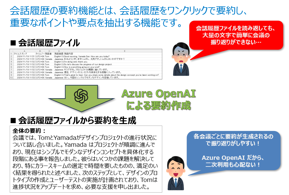 ※Azure OpenAIのGPT-4は、ChatGPTと同じ技術を利用しています。要約に使用される会話履歴情報が学習などのディープラーニングで二次利用されることはございません。