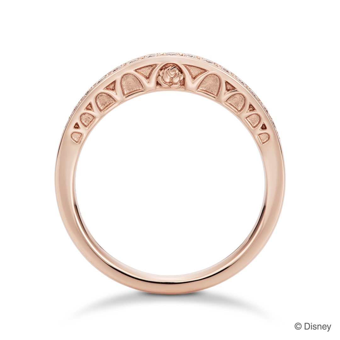 「ボールルーム」と「魔法のバラ」をモチーフに、『美女と野獣』の世界観を表現しました。1列に連なるダイヤモンドは、自分の価値観を大切に迷わず行動する「ベル」の決断力を表しているかのようにきらめきます。