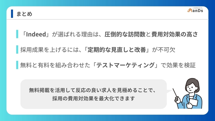 Indeedの運用型広告としての特性を最大限に活用するには、継続的な改善を行う手間がかかりますが、その分、費用対効果が高まることが調査でも確認されました。特に有効な方法として挙げられるのが、Indeedの無料掲載と有料掲載を組み合わせた「テストマーケティング」の実施です。具体的には、無料掲載を利用して複数の求人票を公開し、それぞれの反応を検証したうえで、特に反応の良かった求人票を有料掲載に移行させる手法です。