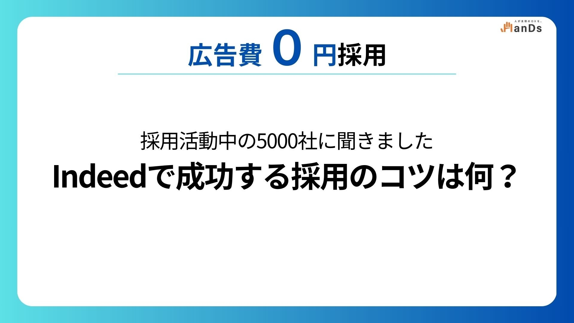 HanDsでは、Indeed を含む『0円採⽤』のつくり⽅について、期間限定でオンラインの無料サポートを実施しています。まずは現状の採用サイトや求人票を無料診断し、改善方法をアドバイス。従業員10名に満たない企業も成功している、採用のノウハウをお伝えします。