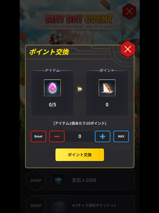 メーデーイベントではゲームをプレイして獲得したイベントアイテムとポイントを交換して、様々な報酬を獲得できます。