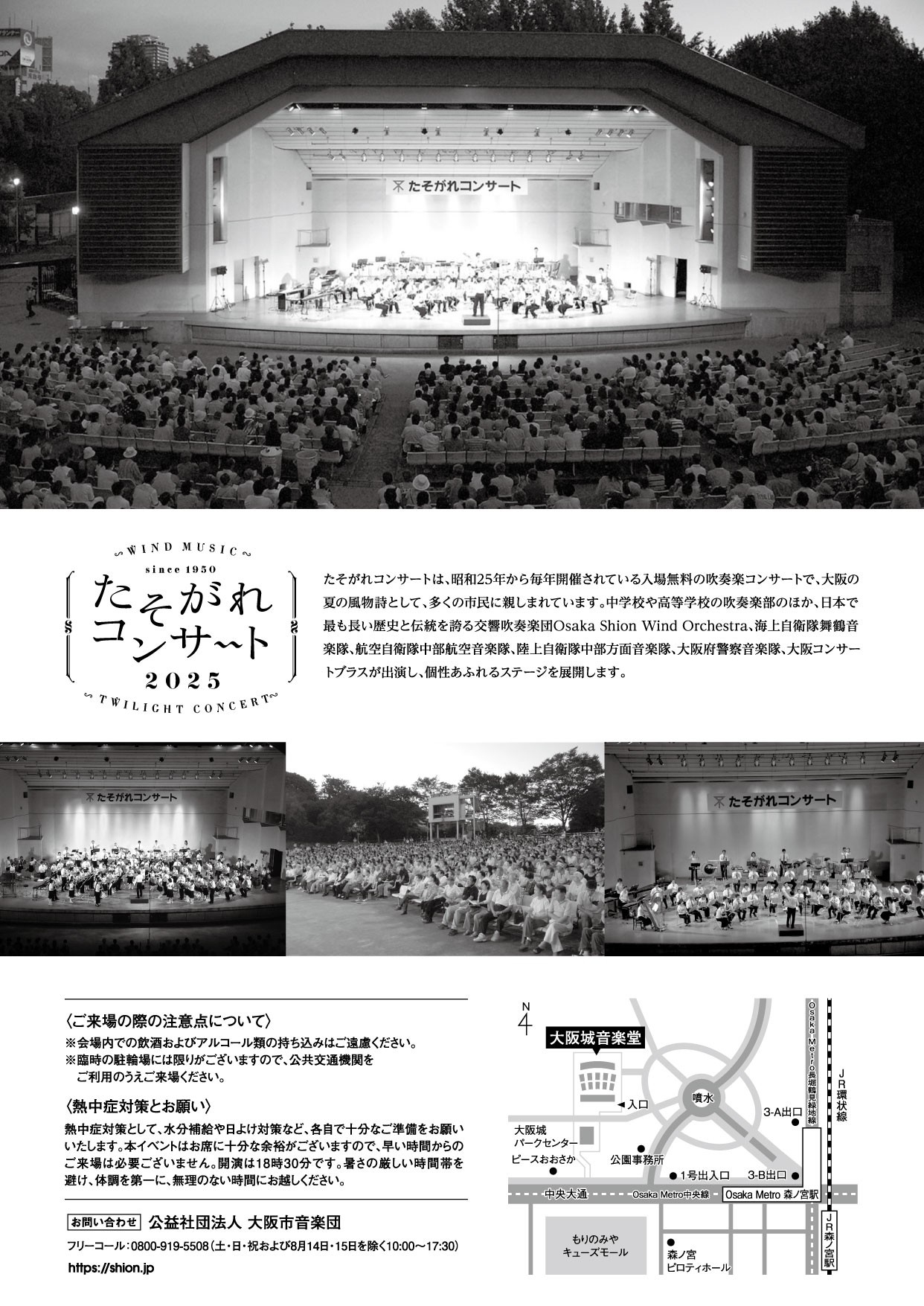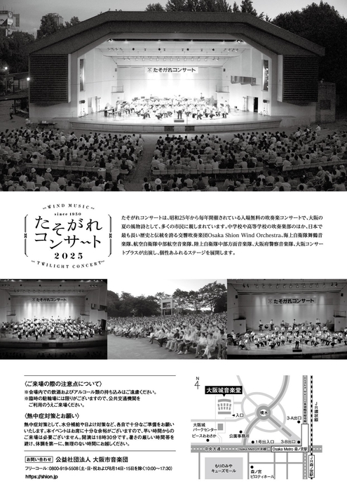 日本で最も長い歴史と伝統を誇る交響吹奏楽団のOsaka Shion Wind Orchestraを有する公益社団法人大阪市音楽団(本社:大阪市住之江区/理事長:石井徹哉)は、今年も7月9日、16日、23日、30日、8月6日、13日、20日の全7日程で「たそがれコンサート」を開催いたします。