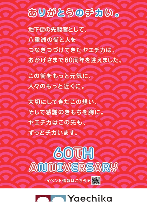 2025年6月1日で開業60周年を迎えるヤエチカは、様々な人が集う周年「祭」を通して、これまでヤエチカに関わった全ての皆さまへの感謝と、これからをお伝えするべく、「ありがとうのチカい。」をスローガンとして60周年祭を開催します。