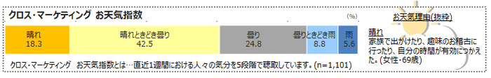 クロス・マーケティングお天気指数とは、直近1週間における人々の気分をお天気で表したものです。お天気の理由も一部抜粋してお知らせします。