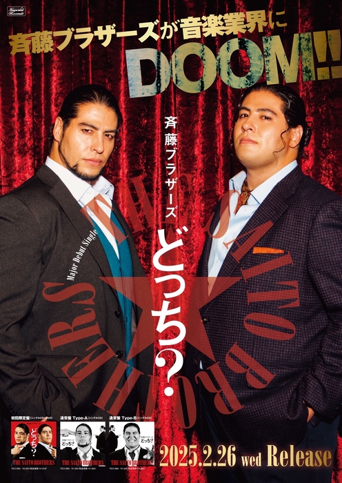 史上最強の双子プロレスラー 斉藤ブラザーズ が音楽業界にDOOM!! メジャー デビューシングル「どっち?」2月26日リリース! (はなわが楽曲提供)