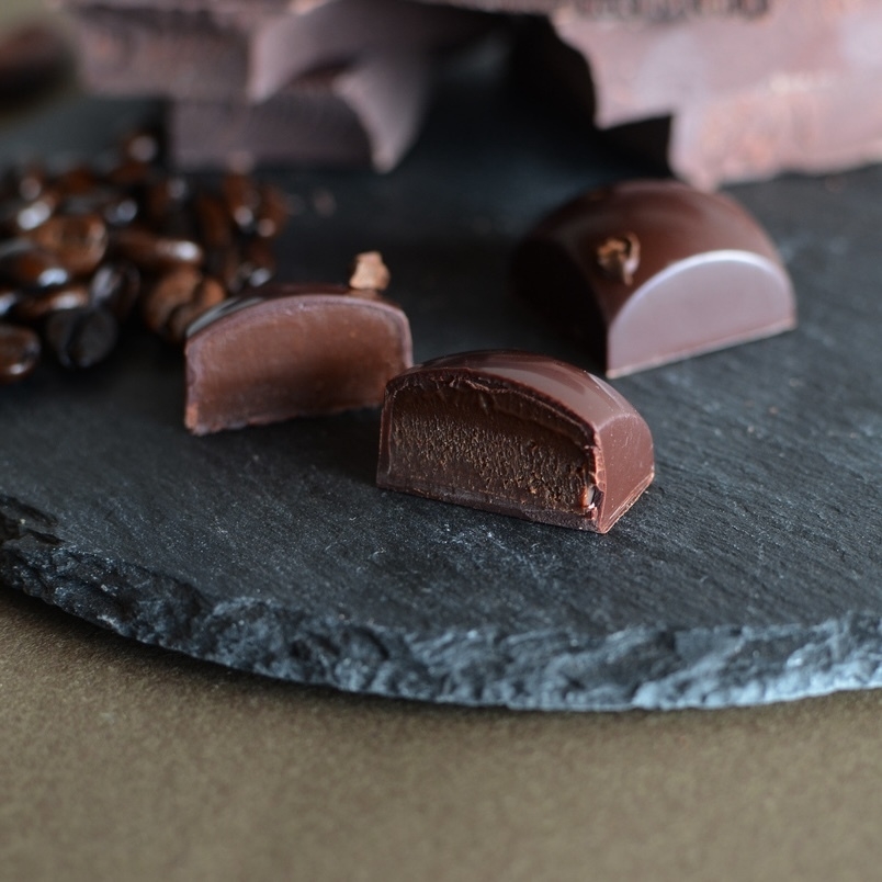 東ティモール産コーヒー豆を抽出したココナッツクリームのガナッシュ。ココナッツに濃縮されたオーガニックコーヒーとカカオの香りが相性抜群。