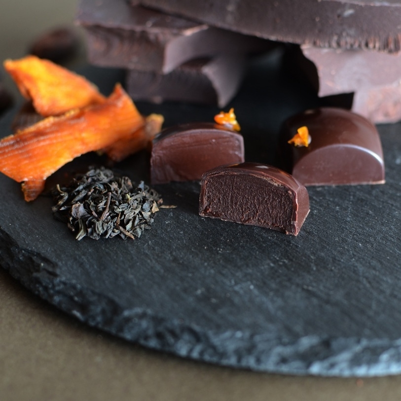 アールグレイとマンゴーピューレのガナッシュ。ドミニカ産カカオ豆の個性を活かし、アールグレイの香りとマンゴーの酸味を際立たせたフルーティーさ。