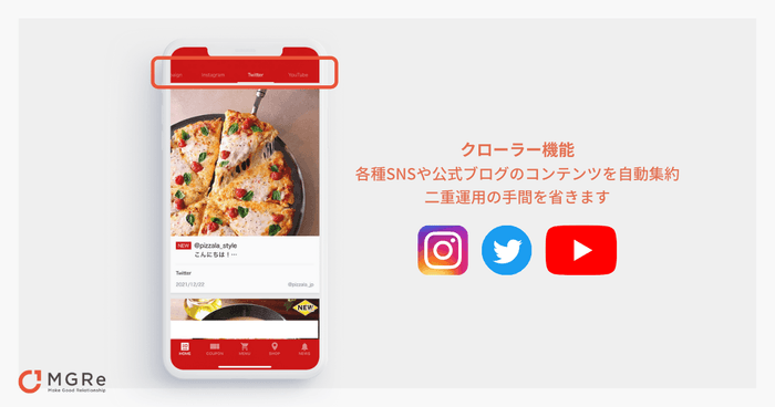 TwitterやInstagramなどSNSアカウントとアプリを連携し、アプリ上に情報を集約。クローラー機能*によってコンテンツを自動集約しているため、アプリとSNSの二重運用の必要もありません。