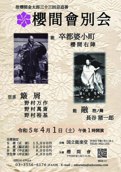 櫻間會主催、故櫻間金太郎三十三回忌追善『櫻間會別会』が2023年4月1日 (土)に国立能楽堂(東京都渋谷区千駄ヶ谷4-18-1)にて上演されます。