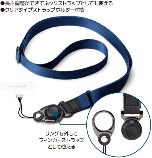 お気に入りのケースに挟むだけで快適なショルダータイプに切り替え可能なストラップホルダー付 ショルダーストラップです。リングを外してフィンガーストラップとしても使用出来る2WAYタイプ。ストラップホールがなくても付属されている「ストラップホルダー」をケースに挟むだけでストラップを取り付けする事が可能です。(※お手持ちのケースや充電口の形状によってはホルダーが収まらない場合があります。)最長140cmの長さ調整ができてネックストラップとしても使用出来ます。(耐荷重:3kg)