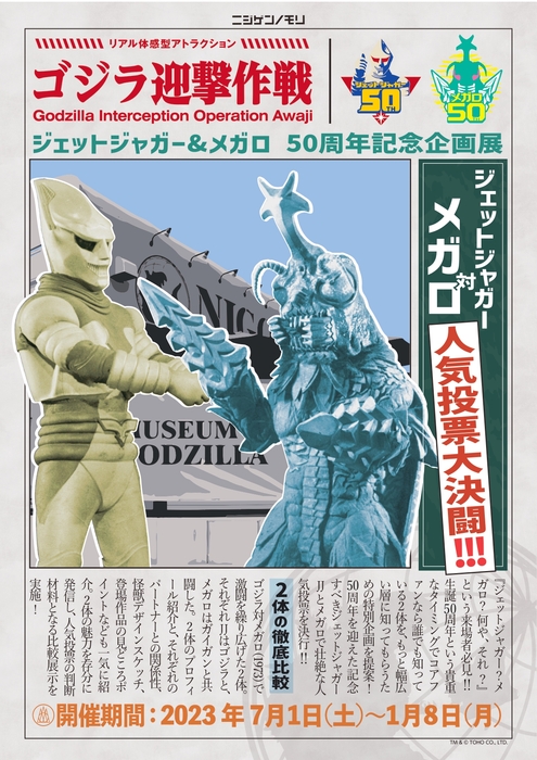 ニジゲンノモリの大人気アトラクション「ゴジラ迎撃作戦」ゴジラミュージアム内で、映画「ゴジラ対メガロ」の公開50周年を記念し、ミュージアム企画展「ジェットジャガー/メガロ特別展」を2023年7月1日(土)~2024年1月8日(月)の期間限定で開催致します。本企画展では、50周年を迎える作品の昭和レトロかつコミカルなオリジナル展示のほか、名場面を再現したジオラマの展示を行います。また、映画の中で熱い闘いを繰り広げた、ジェットジャガーとメガロの『人気投票大決闘』を実施します。人気投票には、ジェットジャガーとメガロとゆかりのあるあの怪獣たちからも応援! ファン必見の特別展を、ゴジラ愛溢れる仲間とともに遊びつくそう!