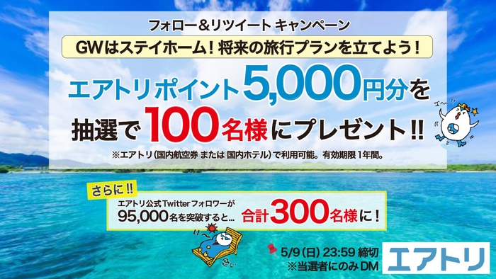 今年のGW は #ステイホーム する人を応援! エアトリ公式Twitter にて過去最大級のプレゼントキャンペーンを実施 5,000 円分のエアトリポイントを抽選で100 名様にプレゼント
