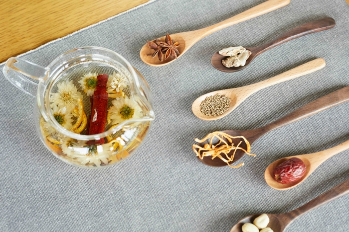 美肌効果や温活が期待できる薬膳食材をブレンドした「薬膳茶」。おしゃれなティータイムにぴったりの一杯が、内側からの美しさと活力を届けます。