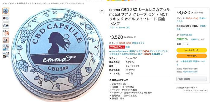 emma CBD 280 シームレスカプセル mctoil サプリ グレープ ミント MCT リキッド オイル アイソレート 国産 ヘンプ