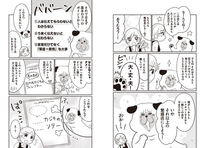 一人と一匹のキュートなコンビが「36の伝わる法則」を駆使し、試行錯誤しながらもお店を繁盛に導いていきます。
