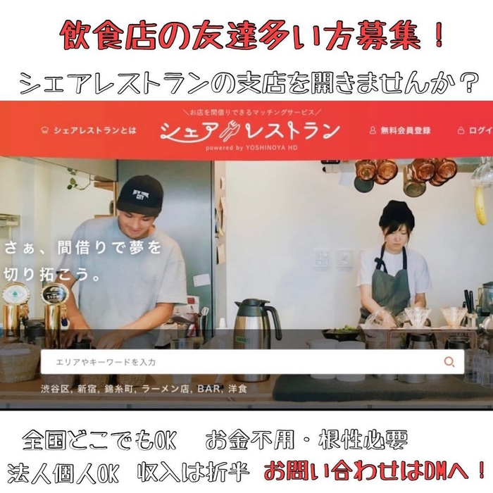 吉野家ホールディングスグループの株式会社シェアレストラン(代表取締役:武重 準、本社:東京都中央区)は、話題の間借りマッチングプラットフォーム「シェアレストラン」の支店経営をしていただける法人個人様を全国(東京含む)で大募集致します。