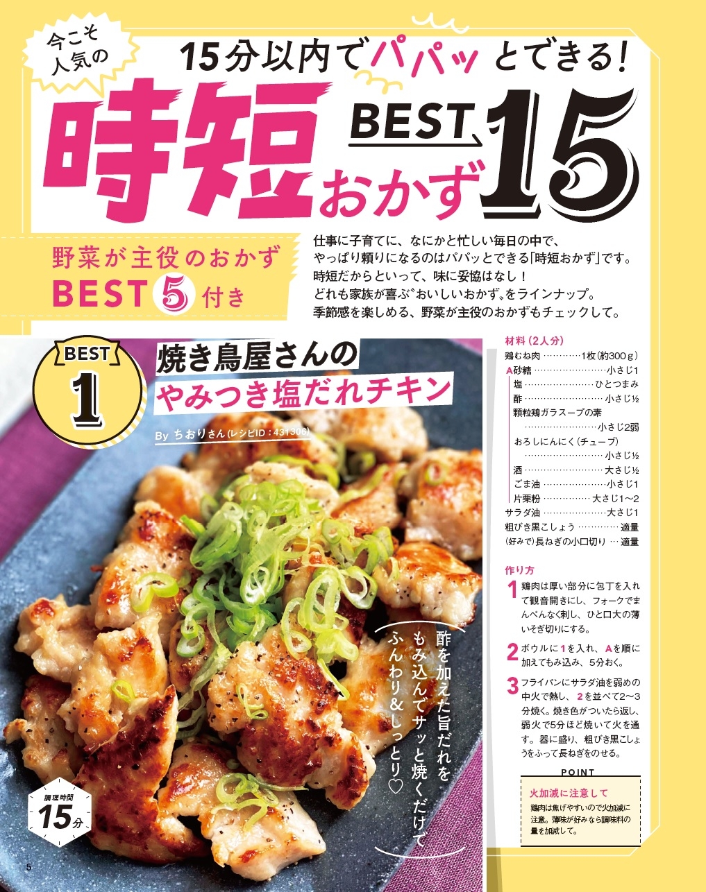 巻頭特集では15分以内で作れる時短おかずを紹介。豆腐の水切りや肉を漬け込む時間など、下準備にかける時間もなし! 作りたいと思ったらすぐにできるレシピだけを集めました。