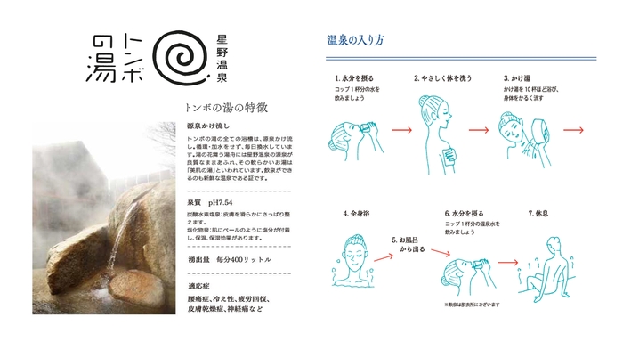 軽井沢の豊かな自然を味方につけて、澄んだ空気を深呼吸するなどの呼吸法を温泉入浴法に取り入れました。呼吸法で肺機能向上の面から免疫力アップにアプローチします。身体が温まりやすい温泉の入り方や温冷浴などを、呼吸法とともにわかりやすくまとめた「星野温泉 トンボの湯 入浴指南書」も用意しました。