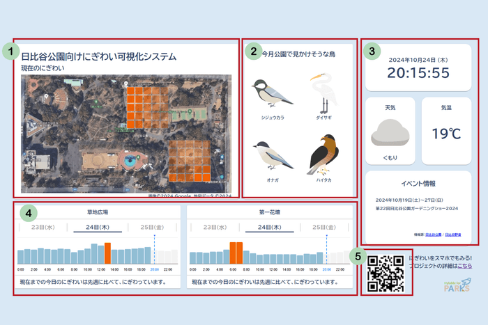 本システムは、先日リリースした実証実験プロジェクトで開発している機能のひとつです。来園者が自身のスマートフォンや公園内のディスプレイを通じて、「草地広場」と「第一花壇」の現在のにぎわいの状況をひと目で確認できるようになります。