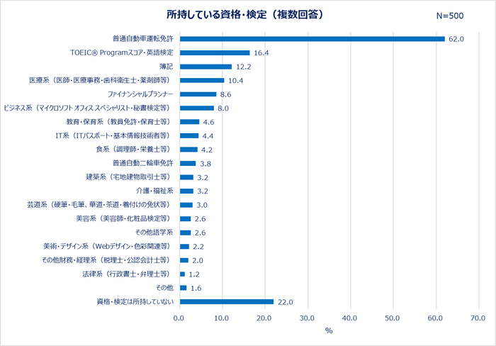 学んでいる・学んでいた理由は「スキルアップのため(47.6%)」「資格・検定取得のため(37.1%)」が比較的多い結果となりました。所持している資格・検定も聞いたところ、回答者の78.0%が何かしらの資格・検定を所持しており、「普通自動車免許」の取得率は約6割でした。その他「TOEIC(R) Programスコア・英語検定(16.4%)」「簿記(12.2%)」など幅広い資格・検定に票が入りました。