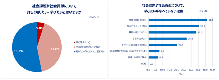 社会課題や社会貢献について詳しく知りたい・学びたいと思うかという質問では、「学びたいが何もしていない(41.8%)」と回答した人が約4割いました。その理由は、学び全般へのネックとしても多くの票が入っていた「時間を捻出できない(41.1%)」に続き、「学ぶ方法が分からない(35.4%)」という人も多いことが分かりました。社会課題への問題意識は持っているものの、学ぶ方法が分からず、知ることができていない人は多いと考えられます。