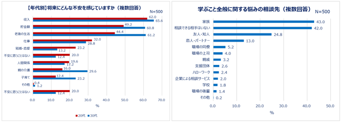 将来への不安が学び始めのきっかけになる場合もあることから、現在将来にどんな不安を感じているかも聞きました。その結果20代の約8割、30代の約9割が、将来に何かしらの不安を抱えていることが判明。20代・30代ともに上位は「収入」「貯金額」「老後の生活」でした。どれも20代よりも30代の方が多くの回答が集まっており、だんだんと将来への不安が増えていく傾向が見て取れ、早いうちから将来に備えておくことは重要だと考えられます。