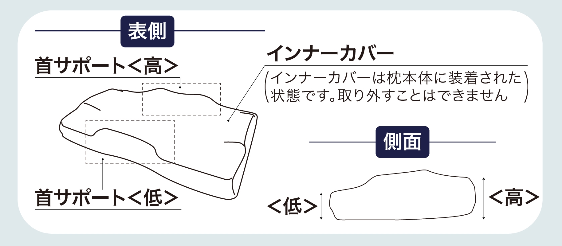 「首サポート」に首を乗せるようにして寝る。好みに合わせて高い側または低い側を手前にして使用