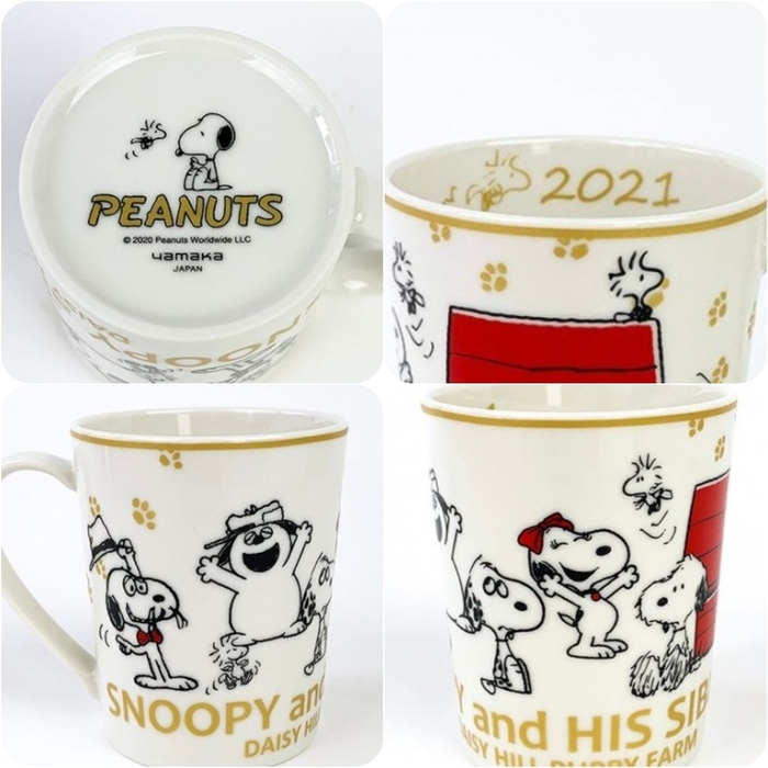 世界中から愛されているスヌーピーから、2021年バージョンのイヤーズマグが入荷しました!スヌーピーと兄弟達が登場する賑やかなデザインで、内側には「2021」のロゴがあります。シンプルなホワイトベースにゴールドのロゴでご年齢問わずお使いいただけます♪350mlとしっかり容量が入り安定感のある形なので、ティータイムもゆったりとお楽しみいただけます。ギフトやプレゼントとしても喜ばれると思います♪