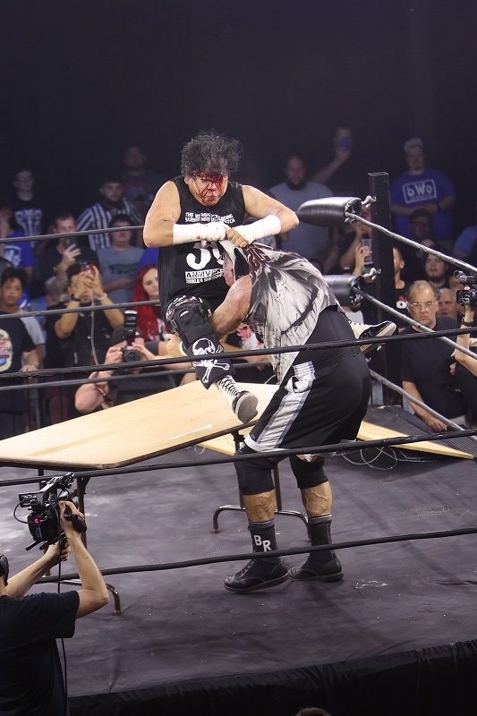 ブリーの代名詞とも言えるテーブルパイルを求める観客の歓声に後押しされ、ブリーがテーブルをセットしている隙に、大仁田が有刺鉄線バットで反撃し、コーナーに追い詰める。