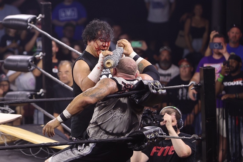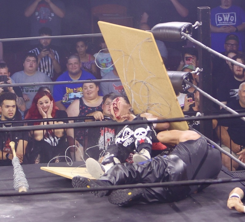 更に大仁田はブリーからギターを振り下ろされ大流血。反撃に出たものの、PCOから有刺鉄線ボードが割れるほど強いタックルを受け、続け様にセントーンを浴びるなど劣勢が続く。