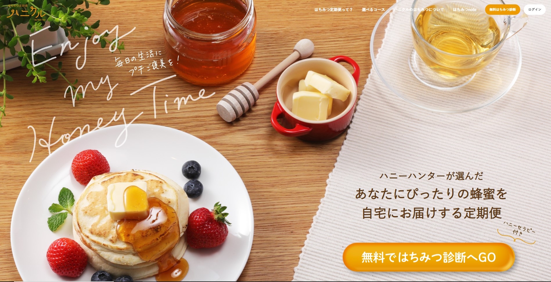 株式会社金市商店(本社:京都市中京区三条通富小路西入中之町21)は、毎月自宅にはちみつが届く、はちみつ定期便「ハニクル」のサービスを2021年8月2日(月)にスタートします。ハニクルのはちみつ定期便は、まず8個の質問に答えて、あなたにぴったり合うはちみつのタイプを診断。診断結果からお好きなコースを選んで申し込むと、毎月違うあなたに合わせたはちみつをお届けします。はちみつは、ハニーハンター市川拓三郎が直接仕入れた100種類を超えるはちみつからセレクト。可愛くて使いやすいシールアップパウチ入りなので、忙しい朝でも手を汚さず使えて便利。さらに、メール便でポストに届くので受け取りもとっても手軽。コースはお試ししやすい1個入りのものから、ハニーハンターイチオシのはちみつが入った3個入りまで、全部で3コースをご準備。ぜひこの機会にハニクルのはちみつ定期便で、毎日の生活に彩りをプラスしてみませんか?