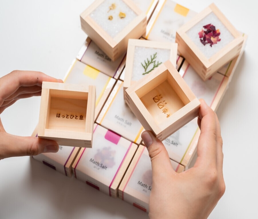 枡の生産日本一の大垣市の枡を使った入浴剤。枡は職人が一つずつ手作業で作り、建築材の端材を使用しているため、環境に配慮した商品です。ソルトが溶け、ヒノキの香りとハーブの香りが浴槽を漂います。