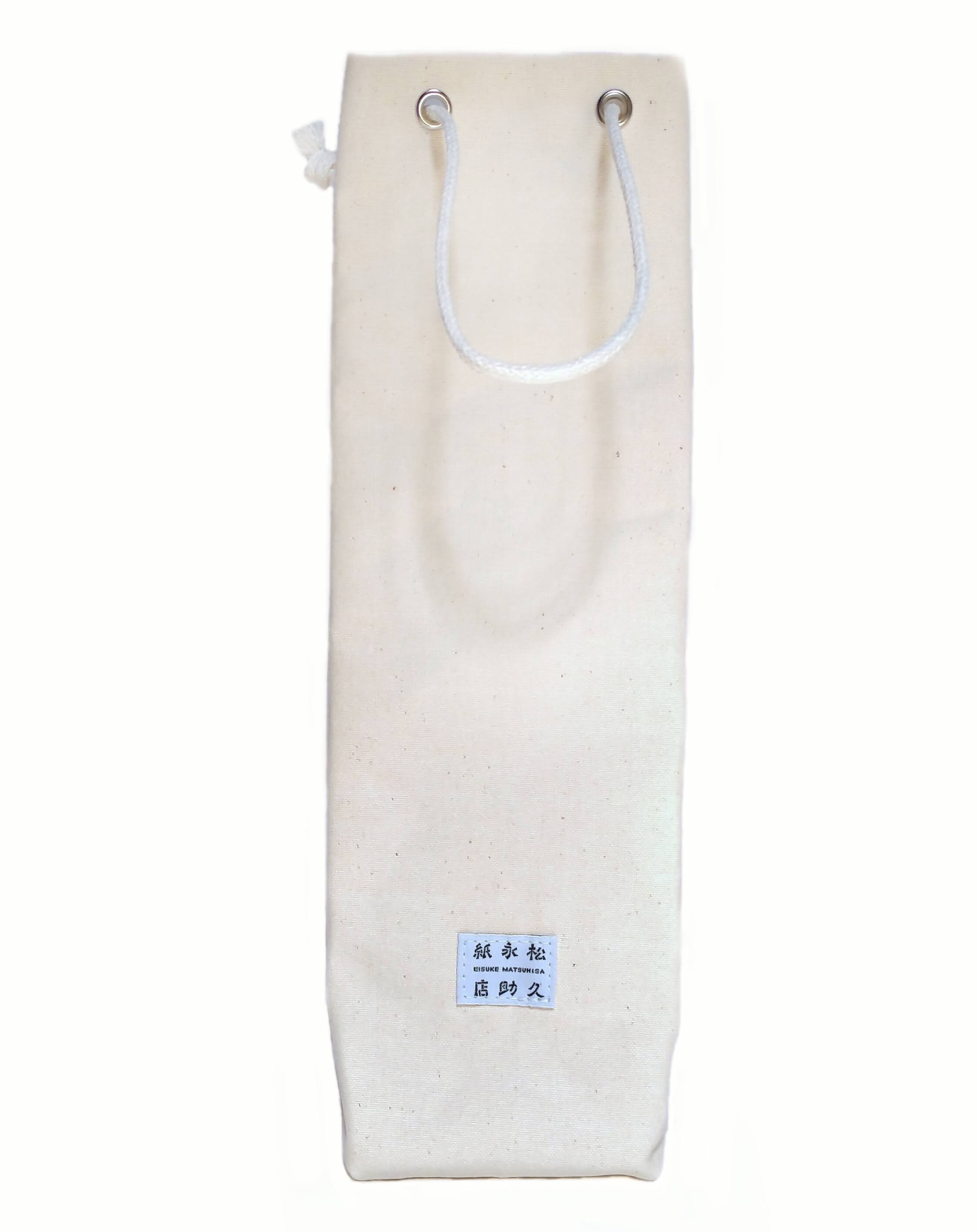 美濃和紙の伝統と薄くて丈夫な特徴を受け継ぐ、美濃和紙の糸。よこ糸に美濃和紙、たて糸に綿を使用し、高島帆布の技術によって織られた上質な紙布帆布で作った軽く丈夫な日本酒・ワインバッグ。袋の口を締められる巾着式です。